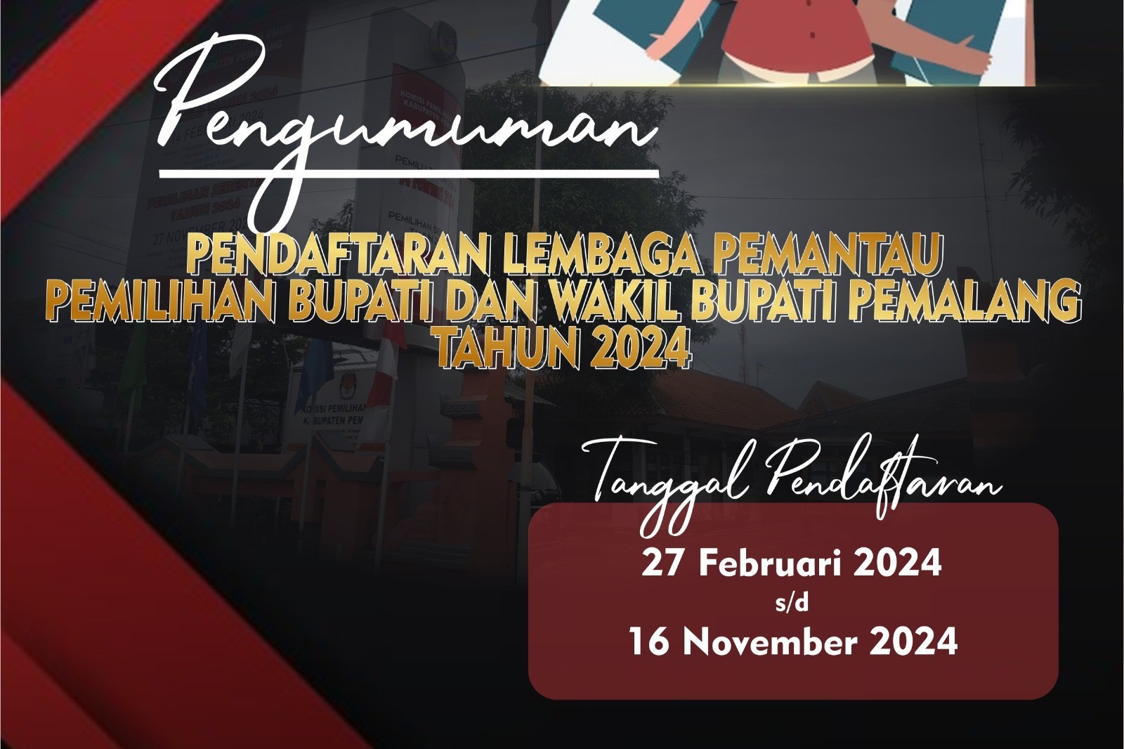 PENGUMUMAN NOMOR 255/PP.03.2/3327/2024 TENTANG PENDAFTARAN PEMANTAU PEMILIHAN BUPATI DAN WAKIL BUPATI PEMALANG TAHUN 2024
