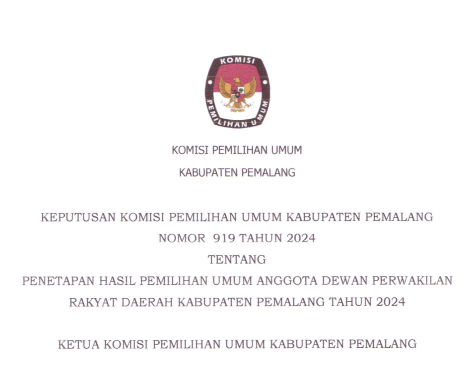 SURAT KEPUTUSAN KOMISI PEMILIHAN UMUM KABUPATEN PEMALANG NOMOR 919 TAHUN 2024 TENTANG PENETAPAN HASIL PEMILIHAN UMUM ANGGOTA DEWAN PERWAKILAN RAKYAT DAERAH KABUPATEN PEMALANG TAHUN 2024