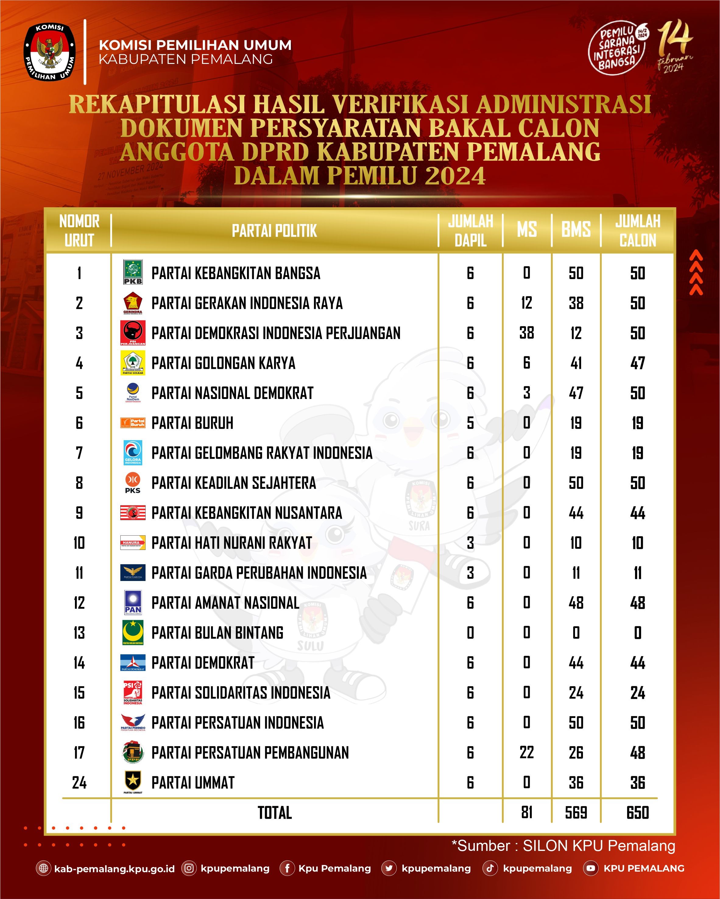 REKAPITULASI HASIL VERIFIKASI ADMINISTRASI DOKUMEN PERSYARATAN BAKAL CALON ANGGOTA DPRD KABUPATEN PEMALANG DALAM PEMILU 2024